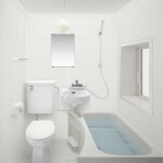 新たにホテル仕様の3点ユニットバスを設置。入口は写真手前に洗濯機置場を移設し、ワンクッション置いた仕方で、リビング側から入れるよう配置換えしました。