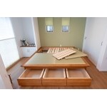 まずは断熱性能を上げるため、窓と、外壁、床下の断熱施工を施しました。 収納が少なかった為、寝室のベッドを造作に畳ベッドに。ベッド下に収納出来るようにしました。