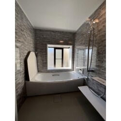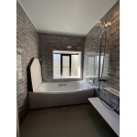 4面をクレアライトグレーのパネルで設えた、中世の石垣を思わせる面持ちを持った、ヨーロピアンな今迄とは異なる重厚で明るく暖かみのある個性的な浴室になりました。