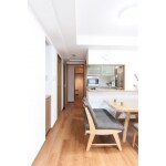 リビングの床には床暖房が入っており、床の貼替となると床暖房の交換も伴い費用がかさんでしまうため、厚さ3ミリの上張り用フローリングにて対応しました。 今回建具は変更していないため、床と建具の色味のバランスを考えてフローリング材を選びました。