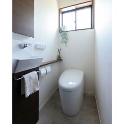 「明るい」トイレにしたいとのご要望もありましたので、圧迫感のないスッキリとした空間に仕上がるよう手洗い器の上に埋込型の収納を設置することをご提案しました。 内装はお客さまに仕上がりのイメージが明確にありました。床材・壁紙のサンプルを取り寄せ、イメージと相違がないか確認していただきました。 床は石目調クッションフロア、異素材風のコーディネイトで調和をとっております。 木の温もりを感じながら癒されるリラックス空間に仕上がりました。