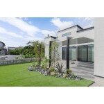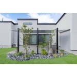 ご新築に伴う外構とお庭の工事をさせていただきました。大きなリビングの窓前にテラス空間をご提案。ガレージから車をお庭へ乗せて洗車をしたいとのことでしたのでテラスはガレージとフラットの高さでつくりました。仕上げのタイルは車対応の商品を使用しました。カーポートSCをテラス屋根としてご提案。シンプルな建物にスタイリッシュなSCが良く合い、急な雨や暑い日差しを遮ってくれます。窓の前には植栽帯をつくり、四季も楽しんでいただけるお庭となりました。