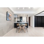 内装は白を基調とし、床もホワイトオークの床材を使用。キッチンの色味に選んだブラックを空間のアクセントにして、壁面にグレーのエコカラットタイルをあしらいグラデーションを作ることで空間の調和と取りました。