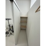 短い期間で作業をするために、施術室の一部に物入を設置することにします。収納棚は物入の両端に設置していますので、多くの物を置くことができ、場所の把握もしやすくなるのではないでしょうか。とご提案致しました。