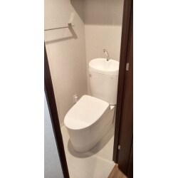 汚れにくくお掃除がしやすい、すっきりとしたデザインのトイレへ交換しました。 便器は汚れを浮かせて滑らせる特殊加工がされており、トルネード洗浄で少ない水でしっかり汚れを落とします。 便座裏は継ぎ目がなく、汚れを弾くクリーン樹脂を使用しています。 便器はフチなし形状でお手入れ楽々です。自動できれい除菌水をふきかけて汚れを制御し、キレイが持続します。手洗いは深さがあり水はねしにくい形状でしっかり洗いやすいです。 手洗いは深型で、きちんと洗いやすい形状設計。 スッキリとしたデザインのトイレに合わせ、白を基調としたクロスと床へ貼り替えし、明るくて使いやすい空間に変わりました。