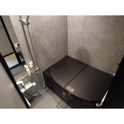 浴槽・エプロンはブラック、壁パネルは全面グレーで統一しました。