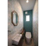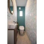濃い目の色合いのアクセントクロスを組み合わせた、おしゃれでかわいいトイレ空間です!