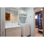 洗面所は、洗濯パンのサイズを小さくすることで、収納棚を設置することが出来ました。 TOTOの洗面台サクアと同じシリーズの収納棚をお選びになり、一体感のある洗面所となりました。