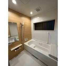 ユニットバスを設置しました。 全体的にホワイトと淡いブラウンで統一されており、落ち着く空間となっております。 浴槽が広くゆったり浸かることができ、手摺がついている為転倒等の心配も少なく安全です。