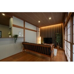 繊細な欄間、目を引く木目の玄関壁、艶のある木目の柱… 元々の住まいが持つ古き良き日本らしい素材やデザインを生かしつつ、現代のライフスタイルに合わせた空間となりました。 1Fの和室だった空間の柱や梁は残しつつ、色味を合わせた木ルーバーと間接照明を設けることで、 近代的なモダンなテイストをプラス。キッチンは、対面オープン仕様にすることでより空間が広く感じられる空間へ。 現代の生活に馴染みがあるフローリングとしつつも、元々の和の雰囲気も大切とし、2Fはお手入れがしやすいリノベーション畳に。 古き良き部分を残しつつもこれからの暮らしになじむ素材やテイストにすることで、新旧が調和するかたちとなりました。 時代を超えても誰もがどこか安心する、そんな懐かしい未来に繋がるきっかけとなる住まいになりますように。