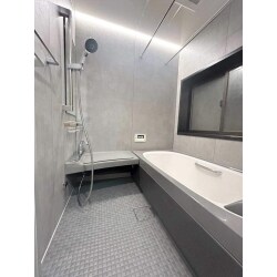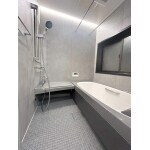 L社のスパージュCZタイプを設置いたしました。 グレー調パネルの「ロッシュグレー」がお洒落さを醸し出しています。正面上部には調光機能付きのライン照明が取り付けられており、昼光色から電球色へ、気分に合わせて光色を調整できます。