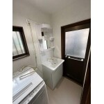 柄の入ったクッションフロアに白いクロスの洗面脱衣所。
