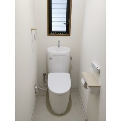 壁リモコンのウォシュレットに取替をしてスッキリ。内装も一新して、明るいトイレに生まれ変わりました。