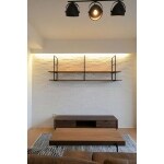 アクセントの壁には立体感のあるブリック調タイルと梁型を利用した間接照明を採用し、奥行感のあるリビングに。リビングとキッチン上部にはお揃いのアイアンフレームのオープン棚を取り付け、照明もブラックに統一し、お気に入りの雑貨やインテリアをどこからでも感じられるこだわりを詰め込んだ空間が実現しました。