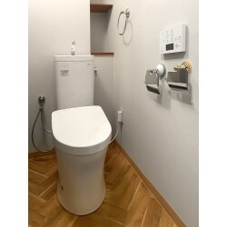 壁リモコンで見た目もスッキリ!タオルリングとペーパーホルダーとマッチしてオシャレで明るいトイレに。
