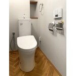 交換するにあたって普段のお悩み等もお聞きしまして 掃除のしづらさだったり、うす暗い室内も気にされておりましたので トイレ本体には陶器面の表面がナノレベルでツルツルなので汚れが付きにくく落ちやすいTOTOピュアレストをご提案。 また、トイレドアは明り取り窓付きのドアをご提案いたしました。 白いクロスに鮮やかでオシャレなヘリンボーン柄のクッションフロア、 小窓から室内の光が優しく入る、とっても明るくて落ち着きのある空間になりました。