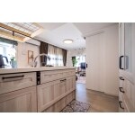お施主様の要望をお聞きしたうえで、対面型のキッチン リシェルSIにするために、配管が干渉しないよう徹底的な採寸を行いました。 カップボードとパントリーのレイアウトは何度も変更し、使い勝手の良い形を提案させていただきました。 L型のキッチンからI型の対面キッチンになったことで、使い勝手が良くなりました。 キッチンから洗面に導線にある可動棚がとても使いやすいと好評頂きました。