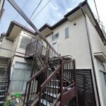 201号室・202号室それぞれに至る外階段があり、鉄部やモルタル部の劣化が進んでいました。壁面にも所々ヒビ・汚れ等が見受けられました。
