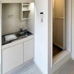 3点ユニットバスをトイレとお風呂を別にして分ける分、やはりキッチンスペースが狭くなりますが、リクシルのミニキッチンは省スペースながら、冷蔵庫置場兼収納スペース、ステンレスシンク、そして節湯シングルレバー水栓・LED照明・換気扇がついたフルユニットキッチンになっています。手の届きやすい高さに水切り棚が付いているので、ちょっとしたお料理・洗い物が可能です。 若者に人気のグレージュの床材に併せ、キッチンのパネルや扉もグレージュ色にしました。シンプルだけどやわらかく優しい色合いです。グレージュは色々な家具に馴染みやすく合わせやすい色合いになっています。お部屋全体の雰囲気が都会的でありながらホッとできる優しい空間になりました。給水給湯配管更新も済ませ、安心して貸し出せるお部屋のご提案をさせて頂くことが出来ました。