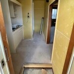 玄関を開けた正面が洗濯機置場と古いキッチン設備が見える感じになり、その奥に3点ユニットバスになっていました。写真左手前のドアは居室に入る入口ドアになります。