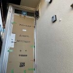 YKKドアリモ。壁を壊さず、今あるドア枠に新しいドア枠をかぶせて取付けるカバー工法でかんたん施工です。カメラ付きインターホンを新たに設置いたしました。