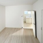 201号室は和室を洋室に変更という事で、壁や天井の板・畳を廃棄し、床材はサンゲツのウォルナットフロアタイルを張らせていただきました。ランダムな濃淡・縞模様が特徴のウッドタイルになっています。 無垢のフローリングのような厚みのある美しい目地表現が魅力で、丈夫で傷に強く、汚れも手軽にお手入れが出来て賃貸物件におすすめの商品です。壁・天井は白いクロスに貼り替え、明るく落ち着ける雰囲気になるよう意識しました。和室の横木の回り縁がなくなりましたので、雨の日の部屋干しや、ちょっとした服かけなどに便利にお使いいただける『ホスクリーン』を、新しく交換するエアコンの風が丁度良く当たる位置に設置するようにしました。 白い壁と床のグレージュの色合いが爽やかで温かいお洒落な雰囲気を生み出し、若い単身者に好まれるお部屋になるようご提案をさせて頂きました。