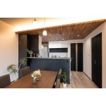 吊り戸を取ってオープンな対面キッチンに。 キッチン上は天井に変化をもたせてアクセントに。 夜は間接照明で雰囲気のあるダイニングになります。 キッチン回りの壁紙に合わせて、建具もブラックにしました。