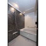 浴室も洗面台と合わせてブラックのパネルでアクセントを。 換気乾燥暖房機はガス式なので、洗濯物の乾きが早いです。