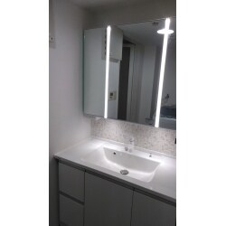 収納たっぷり、お掃除面ラクラク使いやすい商品をご提案させていただきました。 継ぎ目のないボール一体型カウンターなので、サッと拭けてお掃除がらくらく。 水栓は水アカが付きにくい素材で、水気をふきとりやすいなめらかな形状です。 奥まで出し入れ楽々スライドタイプの収納と、背の高い物や大きい物の収納に便利な両開きタイプの収納です。 鏡の表面には吸水性・親水性のある膜がコーティングしてあり、ヒーターレスでお風呂上がりも鏡はいつもクリアです。 ミラーキャビネットには、置き場所に困る家電や日用品を、出し入れしやすくたっぷり収納でき、洗面室がすっきり片付きます。 ミラーはサイドからの均一な光で、背の高さに関係なく、顔全体を明るく照らしてくれるLED照明です。蛍光灯に比べて電気代も節約できます。 クロスとクッションフロアを交換し、キレイでシックな印象に。埋め込み収納はなくし、見た目がすっきり高級感のある空間になりました。 仕上がりに大変ご満足いただき、また他の箇所もお願いしたいと嬉しいお言葉をいただきました。