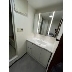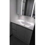 見える箇所に物を置きたくないので、収納がしっかりあるものが希望とのことでした。 洗面ボウルとの間に段差があるタイプの洗面でした。