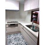 床材や、クロス、キッチンパネル等全体のまとまりを考えてデザイン。アクセントにデザインが入った床材や壁クロスを工夫しました。シンプルな木目のキッチンとも相性がよく、印象的なキッチンに仕上がりました。その他の機能面には、衛生的で節水効果が高いタッチレス水栓を採用。吊戸棚はダウンウォールを取付、収納力や使いやすさが向上しました。