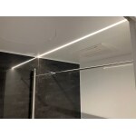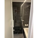 浴槽だけではなく、カウンターに水滴が残りにくく、石鹸のヌメリもサッとひと拭きでキレイに。よく触れる水栓にこそ、水アカを寄せ付けない新素材を使っています。 床は汚れやカビが溜まりやすい浴室の床のスミの目地をなくし、汚れが溜まりにくくしました。 黒とグレーのデザインでシックで落ち着いた浴室になりました。