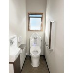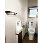 凹凸の少ないデザインの洋式トイレにてお体のご負担を軽減できますようなトイレ空間をご提案させていただきました。手洗器が独立し、内装がモダン系のお色味になりますことでオシャレで落ち着いたトイレ空間になりました。