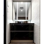 3面鏡収納・引出し収納で収納力が大幅にアップ!シックなマルキーナブラックの扉が高級ホテルのような洗面化粧台に。
