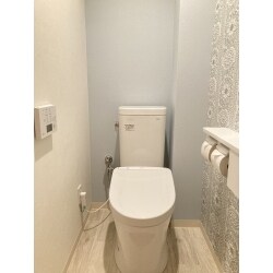 ・育ちざかりのお子さんがいらっしゃるため、トイレは陶器で耐久性の高いTOTOをご提案しました。 ・トイレ室の内装はアクセントを入れて北欧風にというご希望だったため、ホワイト、グレー、ブルーを取り入れて明るい雰囲気に仕上げます。 ・収納付きペーパーホルダーを取り付けの際に、下地が必要でした。将来手すりをつけたいとのお考えだったので、施工時に大き目の下地も準備いたします。 ※下地面積によっての価格変動が少ないため、大きめの下地がオススメです。