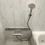 写真の見た目以上に実際はお洒落な輝きを感じるモダンテイストなパネルになっています。シンプルであればあるほどパネルの細長く組み込まれた大理石とゴールドラインのアクセントが光に反射して、心くすぐる上品な輝きで浴室全体を包み込んでいます。