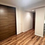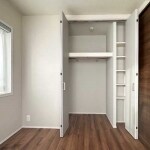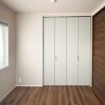 隣のお部屋の床の間を無くし、その分のスペースをこちらの洋室のクローゼット分に間仕切変更しました。すっきり広くなり、収納の容量がぐんと上がりました。扉を4枚折戸にすることで、物の出し入れがしやすくなりました。クローゼット内の新規フローリングと、お部屋の既存フローリングとが、違和感なく調和しております。
