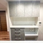 お客様からのご希望を形にする為、イメージしやすいカタログやパース図などご用意させていただき、工事を進めさせていただきました。電話台スペースがいらないとのことでしたので、間仕切り壁を一部解体し、カップボードを広く配置することによって、収納も充実させました。お部屋全体の壁紙は、魅力的なミルクティーカラーの石目調の壁紙に貼替得させて頂きました。リビングドアにはお洒落なバランスで採光の付いた永大産業スキスムS 6Nデザインを採用しました。洋室につながる間仕切引戸と合わせた、木の趣を感じさせる深い色合いのショコラブラウン柄に致しました。格調高く落ち着いたシンプルモダンなリビングルームになりました。