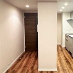 レトロな雰囲気のリビングドアと電話台が角に設置されておりましたが、電話台は使っていませんでした。床材の貼り替えなしに、キッチン側のカップボードを拡張することは可能でしょうか。