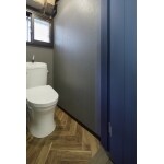 ヘリンボーン貼りの床とブルーのアクセントクロスが印象的なトイレ。内窓は、あえてブラウン色のサッシにして昭和感を演出しました。