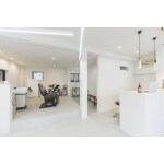 壁の撤去などで部屋を一続きの広い空間にいたしました。開放的でありながら腰壁やカーテンレールの設置で、状況に合わせてプライバシーも守れる機能性も持ち合わせております。既設の造りを活用しながら、印象的な照明やインテリアなどでお施主様のこだわりを強く感じられるようになりました。モールテックスを採用した受付カウンターは耐久性も高く質感に高級感がございます。