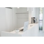 モールテックス仕上げの受付カウンターをご提案いたしました。内装クロスの白に合わせながらも、モルタルのような質感があり壁紙とは違う高級感がございます。カウンター下を収納にすることでお客様からは見え辛くスッキリ片づけることができるようになりました。全体を見渡せ間口を広くとっておりますのでスムーズに動けます。