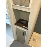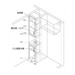 現況の収納も一度壊して作り直しましょう。 上下に分けて収納スペースとして、ゴミ箱は収納スペースの中段を開けてビルトインタイプで造作します。 写真には写っていませんが、天井に物干しパイプも設置しています。