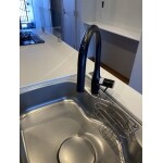新品のキッチンでしたので、ダイノックシートを貼ってお客様の好みのテイストへイメージチェンジさせていただきました。 流行りのDIYですが、職人技でとてもキレイに仕上がってます!キッチンの雰囲気に合わせてカップボードも新設。食洗機とタッチレス水栓を取り付けて使い勝手もアップしております。