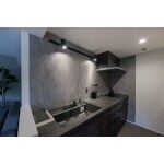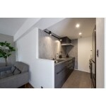 袖壁の一部を撤去することでキッチンの解放感が各段にアップし、LDKとつながりが生まれ、空間も広くなりました。キッチンはインテリアとの調和もよく、セラミックという熱や傷にも強い素材のものを採用。周囲の壁もキッチンに合わせた色合いのキッチンパネルで仕上げています。生活感を抑えたクールな印象になりました。