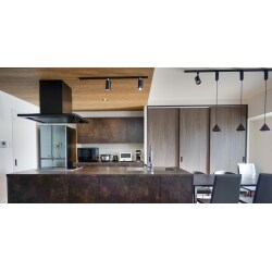 旦那様がお酒を飲むのが好きで、特にご友人と呑むのがお好きとのことでしたので「ダイニングテーブルに6人は座れるようにしたい」とのご希望があり、6人利用を想定したキッチンとダイニングテーブルの位置をプランニングしました。 その際、家事導線にも配慮し、IHクッキングヒーター側にも通路を確保しました。 キッチンはグラフテクトのデュエアイランドをご採用いただきました。ダイニングテーブルもキッチンとお揃いの素材となっています。 照明はテイストに合わせて全て取り替え、ダウンライトも枠が黒色のものを選びました。 ペンダントライトの傘やシーリングライトのデザインはキッチンに合うものをご提案させていただきました。シンク下はオープンスペースにしてゴミ箱置き場に。シンク下をオープンスペースにしたことで収納量が減ってしまったので、カップボードの奥行きを広めの65cmにしてカバーしました。 カップボード横の収納は元々扉付きの上下に分かれたセパレート収納でした。既設の扉を外し、収納の奥行きに合わせて袖壁を新設。新たに扉も設置しました。 収納内部は既設を利用しつつ、見た目をワンランク上のものに魅せるため工夫を凝らしました。