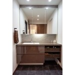 下台はアイカ工業のスマートサニタリーをご採用いただきました。スマートサニタリーはサイズのオーダーが可能で、無駄なく収納スペースを設置できます。 三面鏡の下の壁部分には水ハネ対策ができ、かつ意匠性も兼ね備えたパネルを貼り、間接照明を当てて空間を演出しています。 「リネンボックスも一新したい」とのご希望がありましたが、既設サイズに合わせて既製品を入れることが難しかったため、収納はそのままに、収納扉だけ新規で取り付けました。 収納扉の色は洗面台で使用した扉と色を合わせ、空間に統一感を出しました。