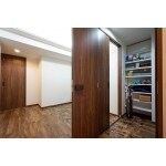 キッチン横の扉はあえて白い建具を設置。壁と同じ色の扉にすることで空間の邪魔にならないように配慮しました。 テレビの背面にはもともと木目板が貼ってありました。ホテルライクやウォールナット色系のテイストがご希望でしたので、テレビの背面にストーンタイルを貼るご提案をしました。 リビングの他の場所は、キッチンやテレビ背面のイメージを邪魔しないようにアクセントクロス等は貼らずシンプルに仕上げました。 「下がり天井のみデザイン性が欲しい」とのご希望があり、明るめの木目調クロスで仕上げました。 他の場所が暗めのデザインだったため、暗くなりすぎないものを選んでいます。