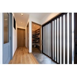 玄関扉は、出入りしやすく光がたっぷり入る引き戸をご提案。 シューズインクローゼットを新設して収納スペースも確保し、ベビーカー等もラクラク収納できるよう設計しました。
