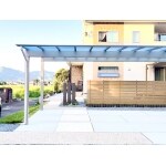 「三協アルミ スカイリード」を設置。3台用のカーポートはアプローチをまたぐように屋根をかけており、雨天時の傘の開閉も楽に行うことができます。スカイリードの最大の特徴である、横桟のない屋根も開放感がありスッキリとしています。インターホンやポストはすでに住宅に取り付けてあったのですが、家族やお客様をお迎えするお家の顔としてコンクリート枕木と植栽を配置しました。